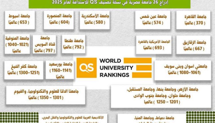 أعلن تصنيف QS العالمى نتائج نسخته للاستدامة للعام 2025، وأظهرت النتائج إدراج 26 جامعة مصرية في التصنيف، والذي شمل أكثر من 1743 جامعة من مختلف دول العالم، وذلك بزيادة 3 جامعات مقارنة بعدد الجامعات المصرية المُدرجة بالتصنيف في العام الماضي 2024.