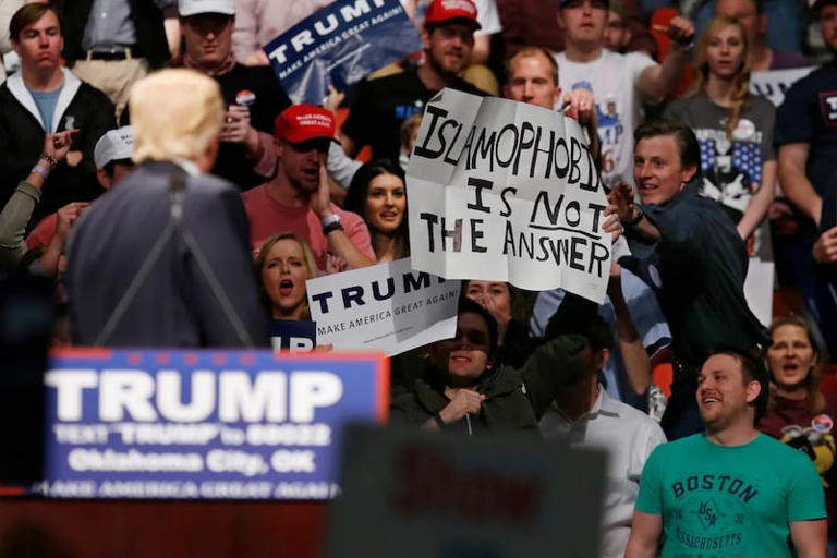وقال معارضو الرئيس دونالد ترامب إن هذا الخطاب قد ازداد جرأة بسببه، مشيرين إلى القيود التي فرضها في ولايته الأولى على دخول مواطني العديد من الدول ذات الغالبية المسلمة؛ وهو قرار سُمّي على نطاق واسع بـ”حظر المسلمين”.