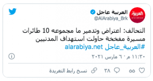 التحالف العربي: اعتراض وتدمير 10 طائرات مسيرة أطلقها الحوثيون