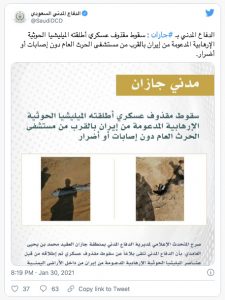 كشفت مديرية الدفاع المدني السعودية، السبت، عن سقوط مقذوف عسكري قرب مستشفى بمحافظة الحرث جنوبي السعودية، أطلقته جماعة الحوثي من داخل الأراضي اليمنية، مؤكدة أن المقذوف “لم ينتج عنه أي إصابات، أو أضرار مادية”.