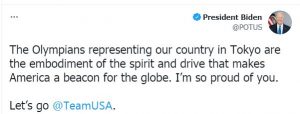 كما حرصت جيل بايدن، السيدة الأمريكية الأولى، على تشجيع الفريق الأمريكي والبعثة إلى أولمبياد طوكيو 2020، حيث كتبت رسالة خاصة لدعمهم والتى نشرها موقع “إن بى سى نيوز”.