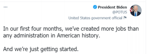 أكد الرئيس الأمريكي جو بايدن، تحقيقه إنجازا كبيرا في مجال توظيف مواطني الولايات المتحدة الأمريكية، لم تسبقه إليه إى إدارة في تاريخ الولايات المتحدة، وأنه مستمر في توفير المزيد من الوظائف، وغرد بايدن على حسابه الرسمي بموقع “تويتر”، قائلا: “في الأشهر الأربعة الأولى من رئاستي، أنشأنا وظائف أكثر من أي إدارة في التاريخ الأمريكي. ونحن ما زلنا في البداية”.