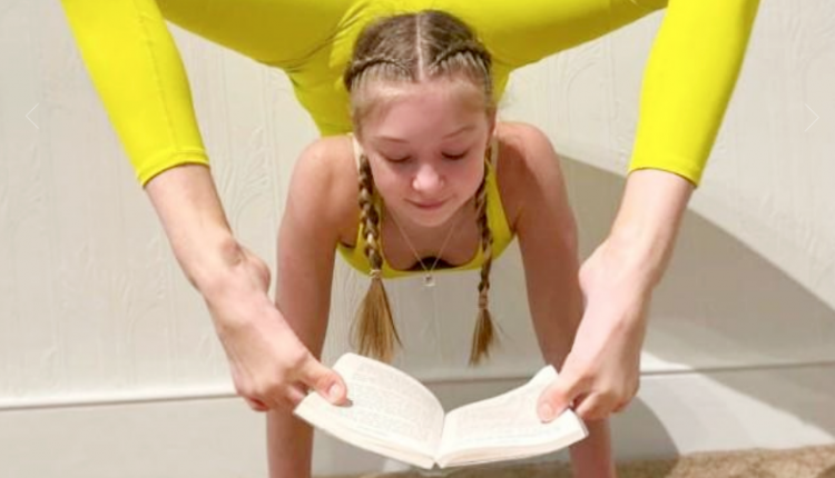 بحركات بهلوانية فتاة تنجز واجباتها المدرسية