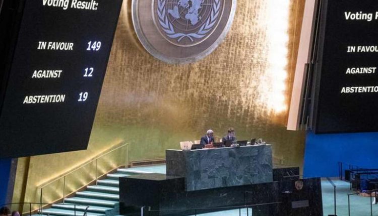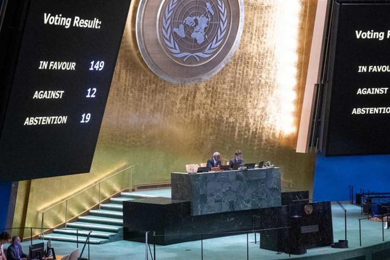 تبنت الجمعية العامة للأمم المتحدة مشروع قرار يؤيد إعلان نيويورك بشأن تنفيذ حل الدولتين وإقامة دولة فلسطينية مستقلة.