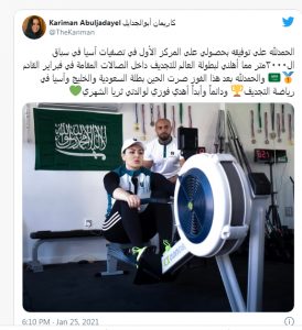 وعبرت أبو الجدايل عن سعادتها الكبيرة بالتأهل إلى بطولة العالم من خلال تغريدة لها عبر حسابها على “تويتر” قائلة: ” الحمد لله على توفيقه بحصولي على المركز الأول في تصفيات آسيا في سباق 2000 متر مما أهلني لبطولة العالم للتجديف داخل الصالات المقامة فبراير المقبل”.