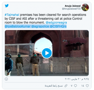 أجلت السلطات الهندية أكثر من ألف سائح، صباح اليوم الخميس، من ساحة ضريح “تاج محل”