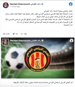 لمتابعي صفحة الأستاذ راشد الغنوشي..نشرت الصفحة خطأ تهنئة للترجي الرياضي التونسي بالفوز بكأس إفريقيا، بينما