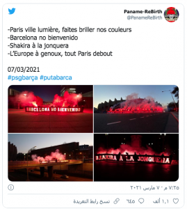 ورفع مشجعو الفريق الباريسي لافتة مهينة في حق المغنية الشهيرة شاكيرا، حملت عبارة “شاكيرا لا جونكيرا”،
