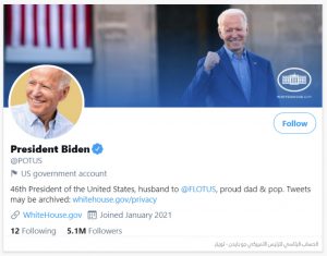ولا يزال لدى جو بايدن حسابه الشخصي على تويتر (JoeBiden)، ولديه 25.9 مليون متابع حتى الآن.
