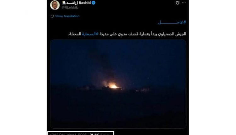 تداول مستخدمين بموقع التواصل الاجتماعي «إكس» في الساعات الماضية صورة ادعوا أنها تعود لشن الجيش الصحراوي عملية قصف عسكري على مدينة السمارة الواقعة بالصحراء الغربية، عقب قرار مجلس الأمن الدولي دعم مقاربة الحكم الذاتي المغربية في الصحراء الغربية.