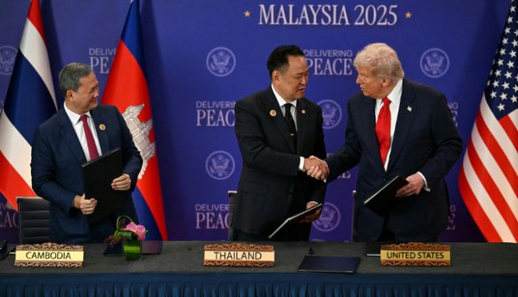 وتم توقيع الاتفاق بين رئيسي الوزراء الكمبودي هون مانيه والتايلاندي أنوتين شارنفيراكويل، كما وقعه ترامب ورئيس الوزراء الماليزي أنور إبراهيم بعد النزاع الحدودي بين البلدين الآسيويين هذا العام.