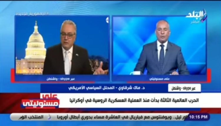 وأضاف د شرقاوي في مداخلة عبر سكايب من واشنطن مع الإعلامي أحمد موسى، في برنامج «على مسؤوليتي» المذاع على قناة صدى البلد، أن بوتين لن يتوقف حتى يصل الى حدود برلين