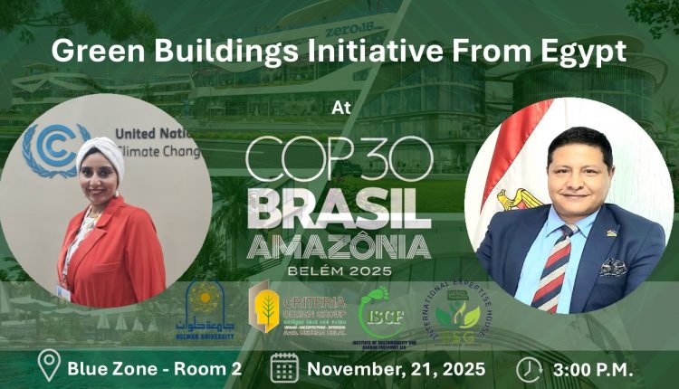 “المباني الخضراء: مبادرة من مصر نحو مستقبل مستدام”، وذلك ضمن فعاليات قمة المناخ COP30 بمدينة بيليم – الأمازون، البرازيل.