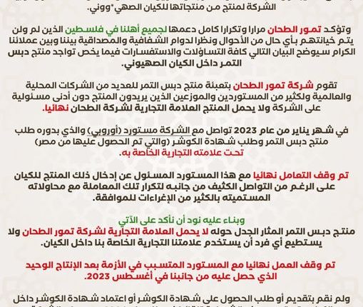 وذكرت الشركة في بيان لها: نود توضيح ما تم إثارته بشأن وجود منتجات تمور الطحان في أراضي الكيان الصهيوني، وفي بداية الأمر نود أن نوضح أننا أولا وأخيرا لا نأخذ أي خطوات تخص أعمالنا إلا بما يرضي الله عز وجل وما نفعله من أفعال وما دخلنا سوق التمور إلا ابتغاء للرزق الحلال وأن نتبع سنة نبينا محمد صلى الله عليه وسلم مرضاة لله ولنبينا.