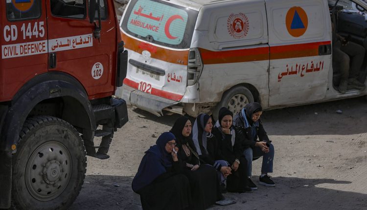 سيدات فلسطينيات ينتظرن فرق الدفاع المدني التي تعمل على انتشال رفات 67 فرداً من عائلة أبو نصر من تحت أنقاض منزلهم المدمر بعد غارة إسرائيلية في بيت لاهيا شمال مدينة غزة 15 فبراير 2026 (إ.ب.أ)