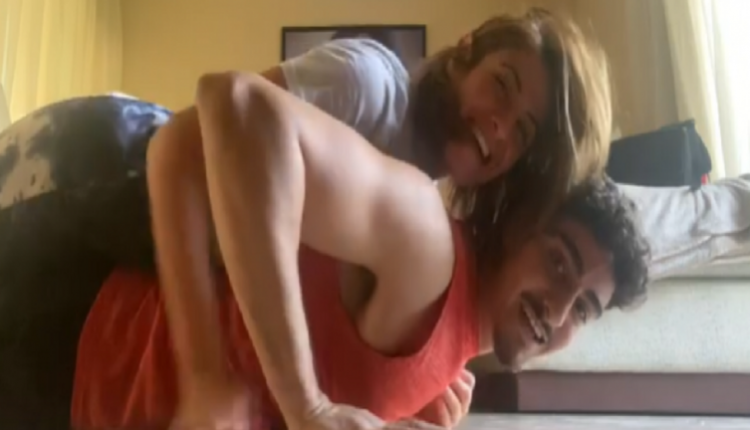 وظهرت الفنانة هيدي كرم في المقطع مع ابنها بعد عودته من الجيم، وهو يحملها أثناء أدائهما تمرينا رياضيا.
