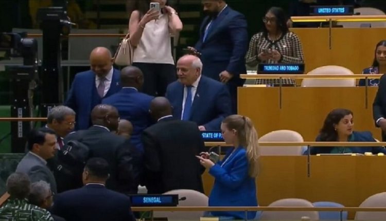 في لحظة تاريخية، جلس مندوب فلسطين الدائم لدى الأمم المتحدة السفير رياض منصور، على مقعد رسمي في الجمعية العامة للأمم المتحدة، ووُضعت أمامه لافتة كتب عليها “دولة فلسطين”.