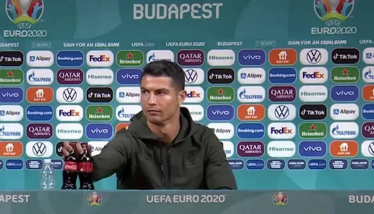 الجولة الأولى لمنافسات “يورو 2020″، وأبعد زجاجتين لـ “كوكاكولا” من أمامه، وأخذ زجاجة ماء وقال للكاميرات إنه يشرب الماء