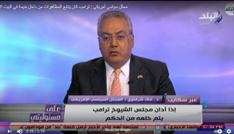 فيديوسياسة خارجية ماك شرقاوي : ترامب كان يتابع المظاهرات من داخل خيمة في البيت الأبيض بواسطة from America في يناير 9, 2021 26 شارك ماك شرقاوي : ترامب كان يتابع المظاهرات من داخل خيمة في البيت الأبيض 26 شارك FacebookTwitterReddItWhatsAppPinterestالبريد الإلكتروني