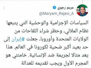 وأكدت في تغريدة على حسابه بموقع التدوين المصغر تويتر، اليوم أن: “السياسات الإجرامية والوحشية التي يتبعها نظام الملالي، وحظر شراء اللقاحات من الولايات المتحدة وأوروبا، جعلت إيران إلى حد بعيد أكبر ضحية لكورونا في العالم”.