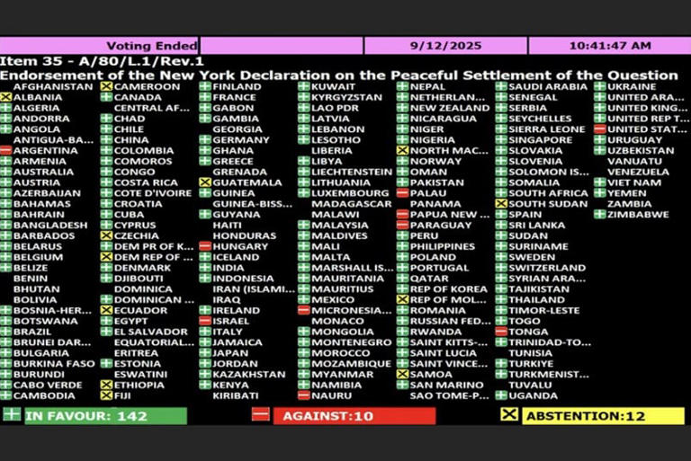 خلال جلسة الجمعية العامة للأمم المتحدة لمناقشة ما يُسمى «إعلان نيويورك» لدعم حل الدولتين في الثاني عشر من سبتمبر الجاري، وبينما اختارت دول غربية معروفة بقربها من إسرائيل، التصويت لصالح فلسطين، غابت دول عربية وإسلامية بارزة عن التصويت، ما أثار موجة واسعة من التساؤلات حول خلفيات هذا الغياب، فدول مثل العراق وتونس وإيران، إضافة إلى دول ذات أغلبية مسلمة مثل الكاميرون وألبانيا وجنوب السودان وإثيوبيا، لم تشارك في التصويت، مع أن دولًا غربية معروفة بمواقفها الداعمة للاحتلال، صوّتت لصالح القرار المؤيد لإنهاء الصراع، ما يعكس تعقيدات سياسية وإقليمية متشابكة، أملت على بعض الدول اتخاذ مواقف تراعي حساسيات داخلية وضغوطاً خارجية، فضلاً عن تحفظات جوهرية على مضمون النص نفسه.