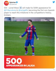 أصبح الأرجنتيني ليونيل ميسي، مهاجم برشلونة، اللاعب الأجنبي الوحيد الذي يشارك في 500 مباراة في الدوري الإسباني، بعد مشاركته أمام هويسكا، الأحد، والتي انتهت بفوز النادي الكتالوني بهدف بلا رد.