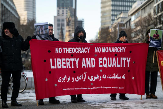 متظاهرون يرفعون لافتة كتب فيها “لا ثيوقراطية ولا ملكية، حرية ومساواة” أثناء تحرك احتجاجي ضد السلطات الإيرانية في برلين في 10 كانون الثاني/يناير 2026